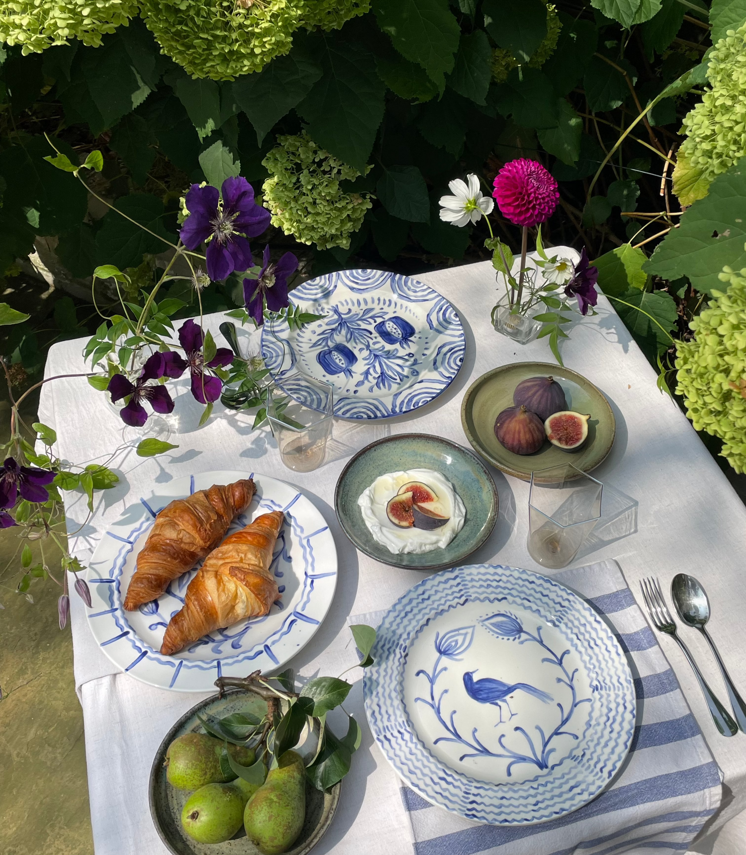 I set myself a goal last year to host four supper clubs, one a season, and then just take pictures and videos as I went and see how I went along. At the time I was working in a job that had me bored senseless. I'd spend all day, every day at my desk, like dreaming of coming home and what I was going to cook and how I was going to make it look. For my first one I made and painted a whole set of dinner plates and that's when I sort of got hooked on the idea of every supper club, I needed to paint a new set. After that the Instagram sort of took off a little and I started getting approached by brands. I was a bit insane. In May I did three courses worth of plates for 45 people and thrown hand painted, which is a bit bonkers. My designs will depend on the season and what I'm cooking. I've done a series of blue fruit plates, bird plates, each with a different colored rim. Pasta bowls with like pastely pinks, blues and purples.