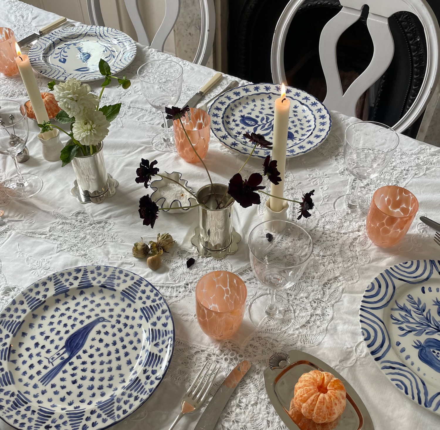 For flowers I use vases from Petersham Nurseries or old Campari bottles. I obviously hand-make all my own plates, serving bowls and platters and even candle holders. For tumblers i've got loads of Venetian glasses. I've got some from a brand called a Mexican brand called Casa Kelva.