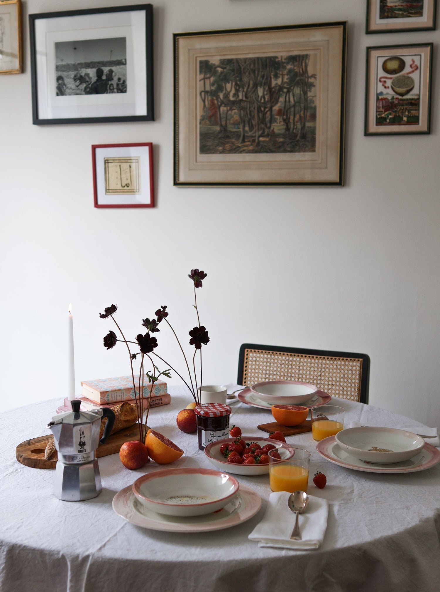 The first thing would be the food. So it would be: what time of year is it? Late April, I'm thinking last of the wild garlic, asparagus. Early summer, it's beans. It's all very green in my mind. I have this calendar called 'Mainly Breakfast' by Emma Cantley, she'll do a little list of all of the seasonal ingredients in the UK. It's cheating really. The colour scheme comes out of that. Seasonal flowers are also important. I always use a white tablecloth, it's very traditional but I just think it gets too busy. I feel like I'm preaching to the choir but candles are essential. When the candles are going and everyone's around the table, it sort of casts this warm, glowing shell, and it feels like you're all, in this little world together. Oh, dinner party playlist! I love French music.