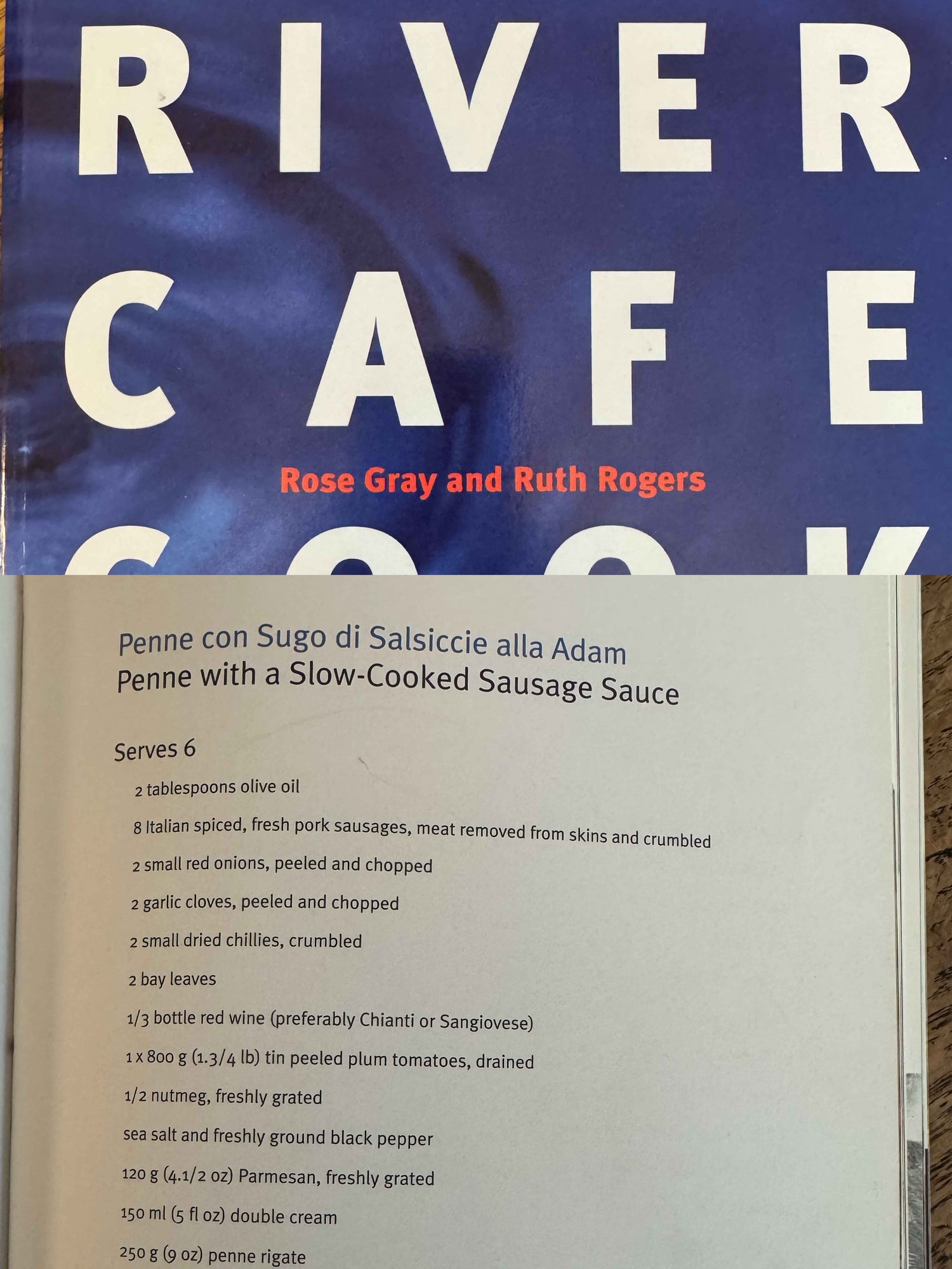 I grew up in an Italian family, so the kind of food that I know really instinctively, it's all Italian, so the River Café cookbook, it's very ingredient- led, very simple Italian cuisine. There's a slow- cooked sausage ragu with penne and fennel and I think I probably make it about eight to ten times a winter. They also have like a big lemon polenta cake or a chocolate nemesis cake, and you just can't go wrong, they're delicious. Diana Henry is another food writer that would be a go- to. She writes beautifully as well. She's got this book called How to Eat a Peach, it all feels very seasonal and instinctive. I recently made her chocolate and olive oil cake.