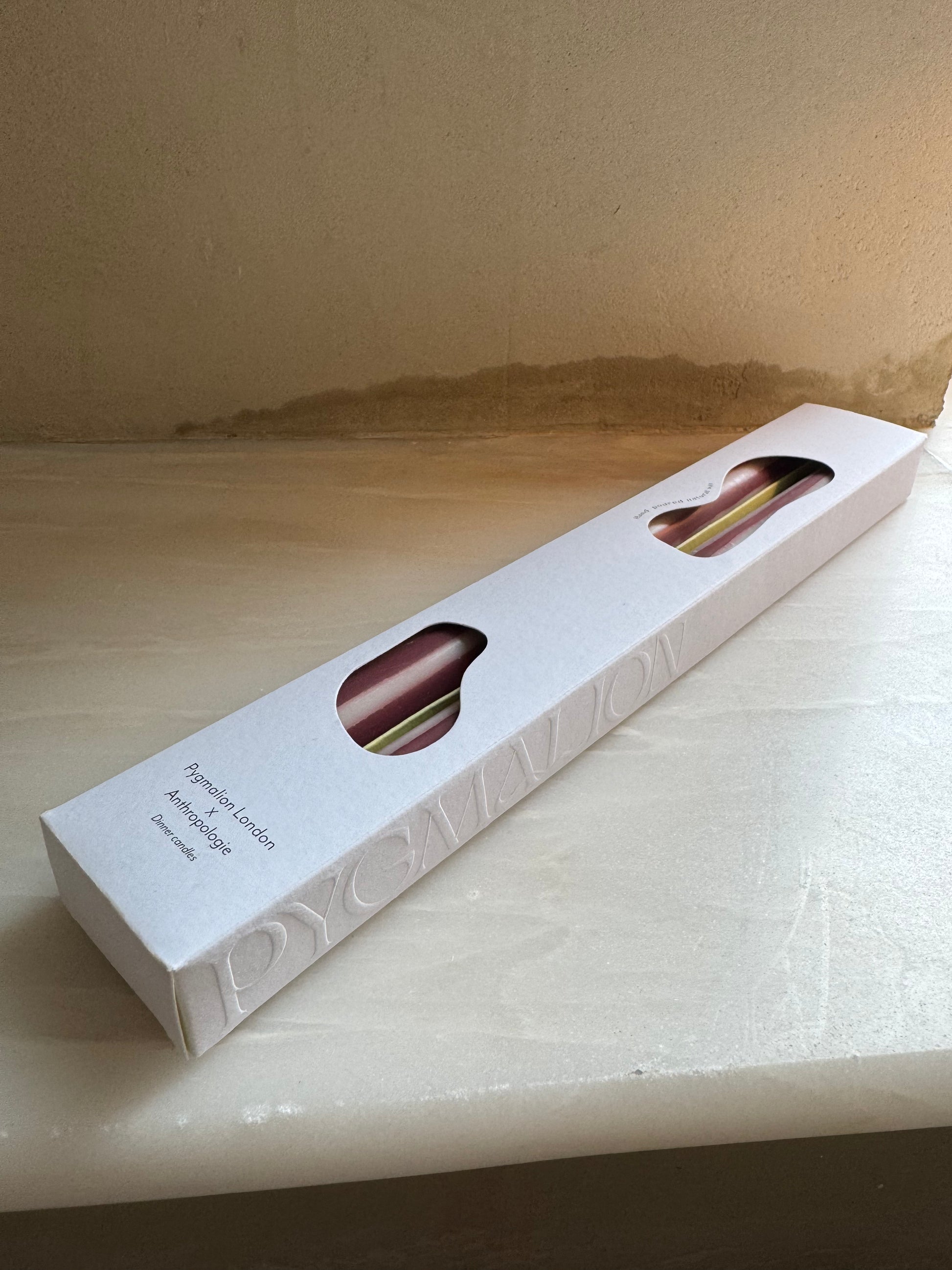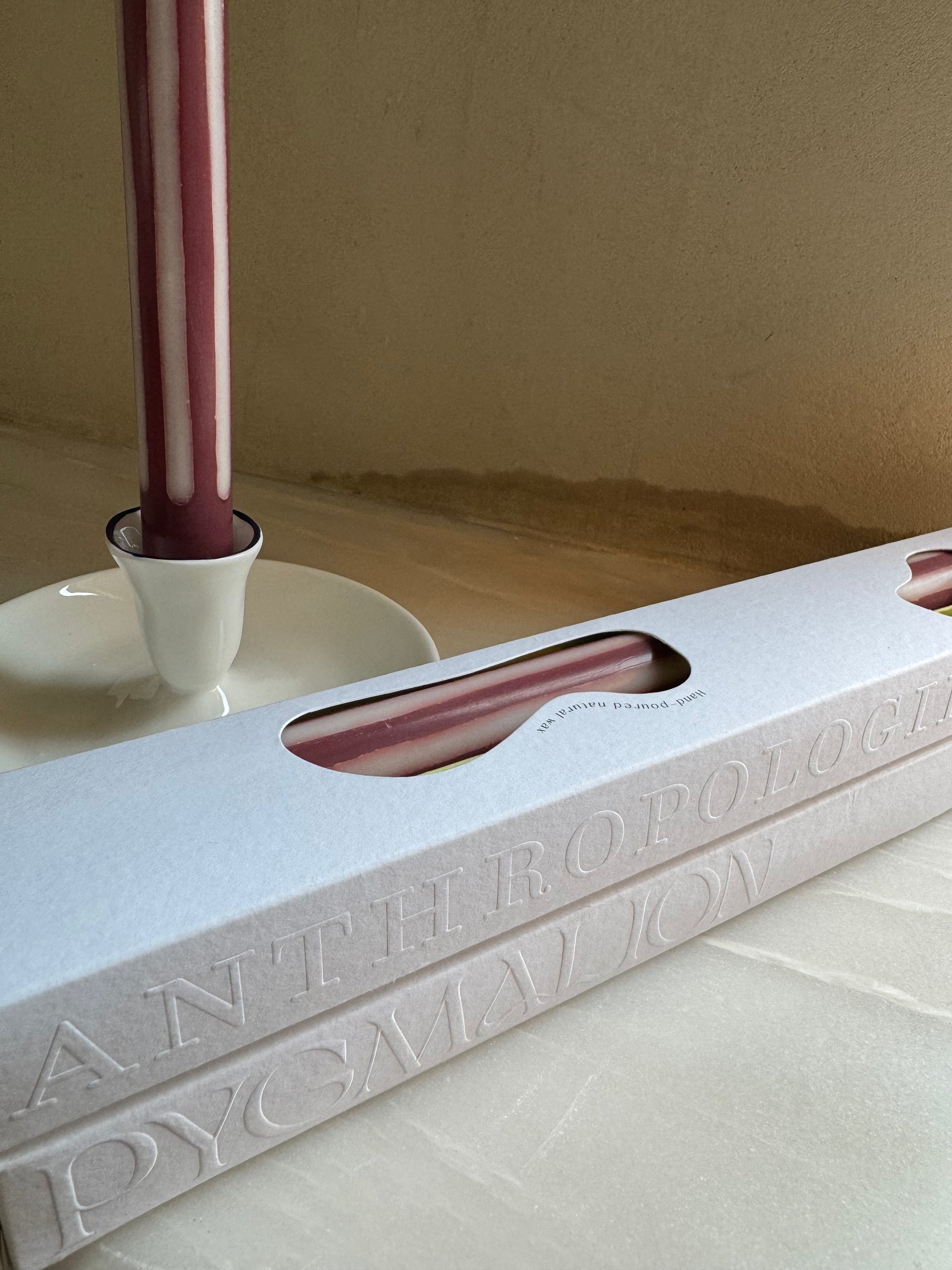 The burgundy and off-white Drawing Room joins our design collaboration with Anthropologie. Each taper is hand-poured into loose stripes using natural wax, pure cotton wicks and natural dyes. Our luxury packaging was designed with the same ethos of quality, design and craftsmanship - using recycled Italian card to make the perfect gift.