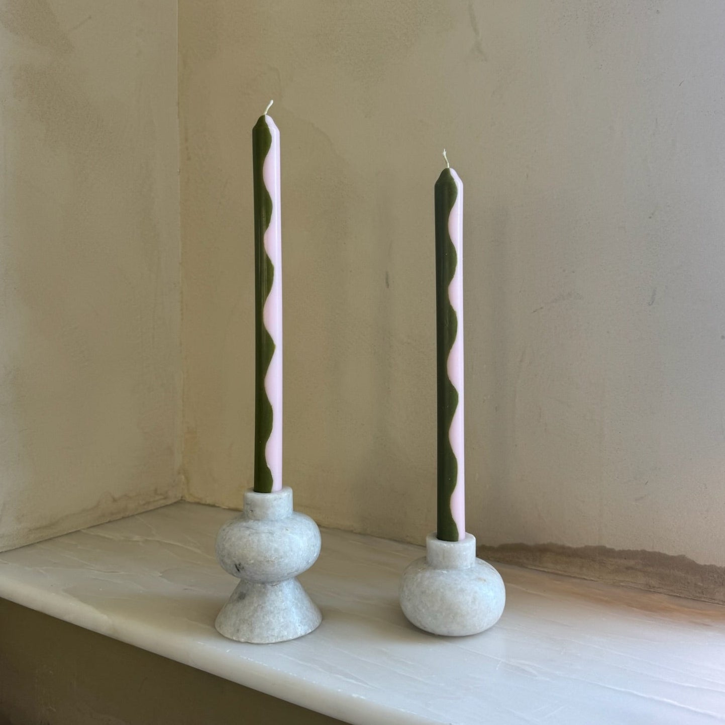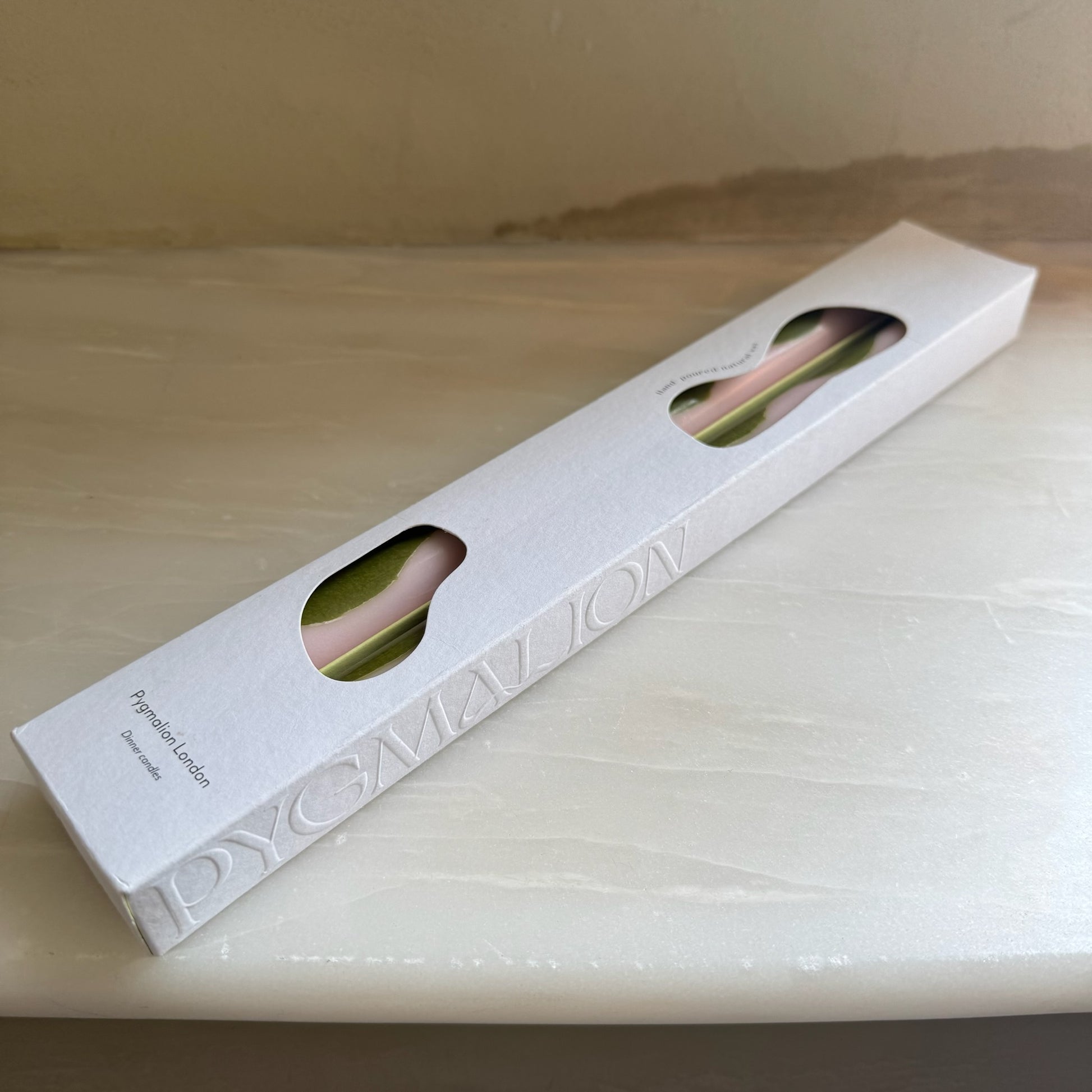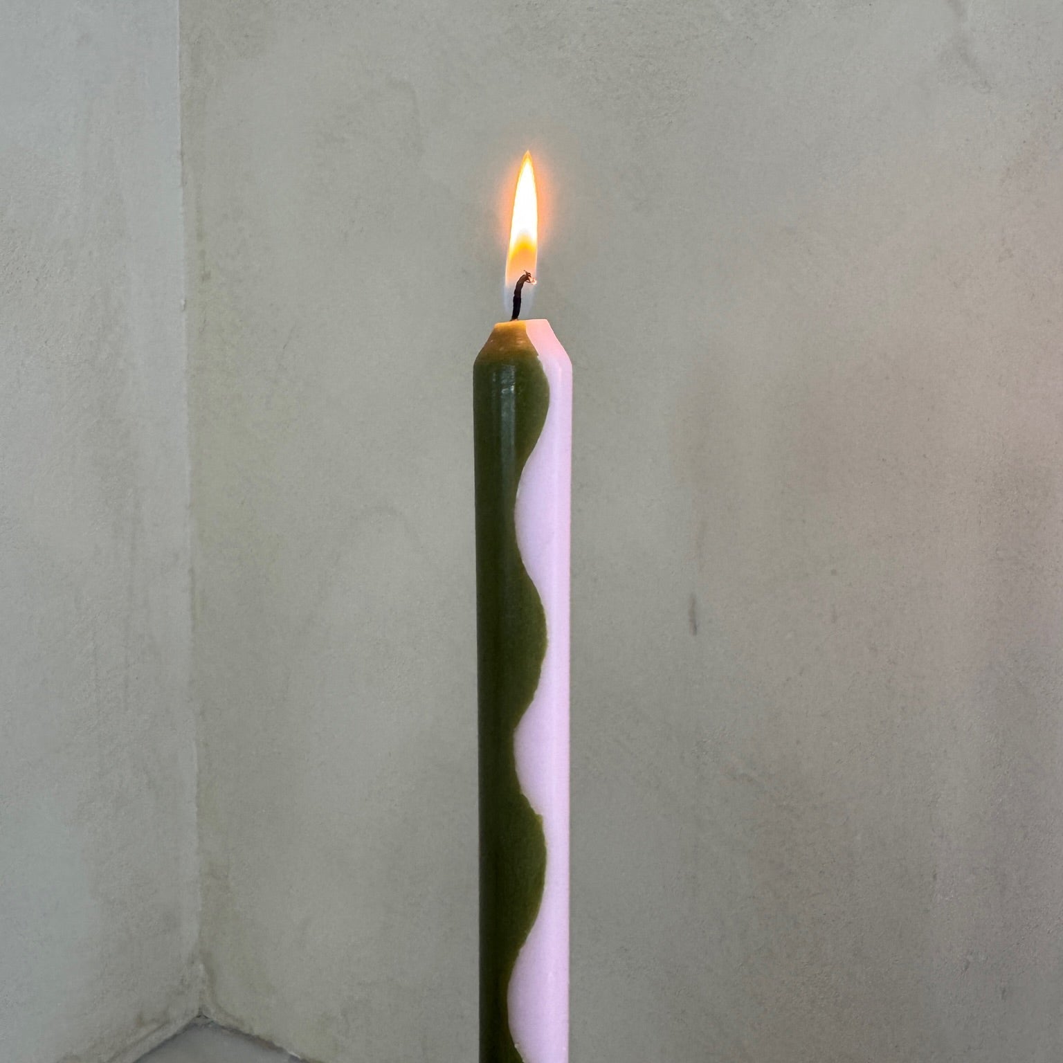 The olive and rose pink Kissing Gate joins our classic wave collection. Each taper is hand-poured into waves using natural wax, pure cotton wicks and natural dyes. Our luxury packaging was designed with the same ethos of quality, design and craftsmanship - using recycled Italian card to make the perfect gift.