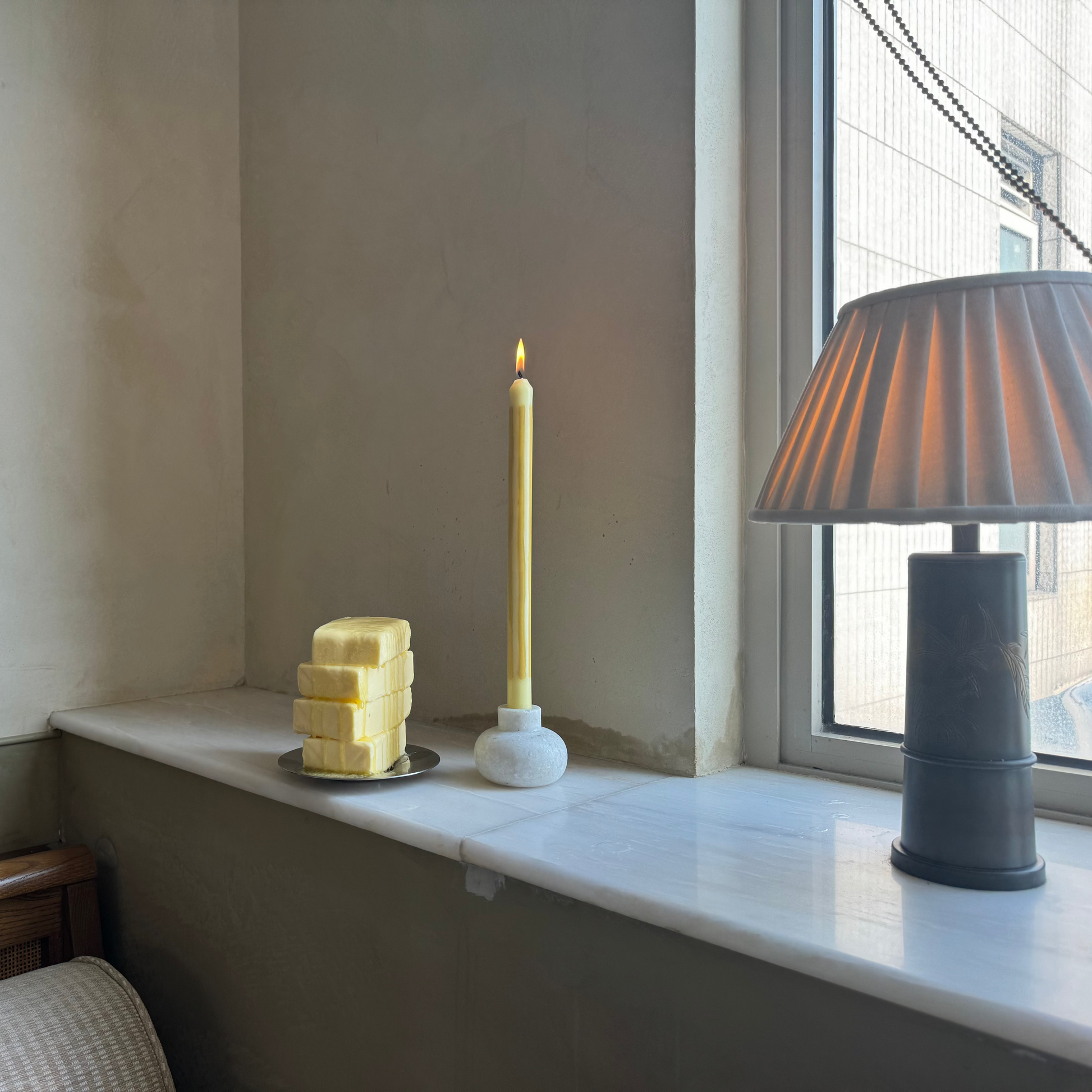 Pair of two dinner candles, hand-poured into loose stripes of mustard and butter yellow vegetable wax.