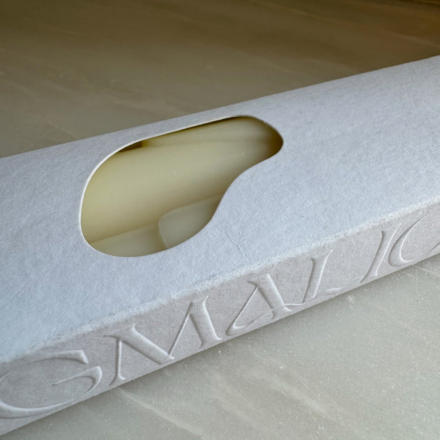 The off-white Oddity is hand-poured into beautifully sculpted natural wax, pure cotton wicks and natural dyes. Inspired by the tale of a sculptor who fell in love with his creation after it miraculously came to life. Our luxury packaging was designed with the same ethos of quality, design and craftsmanship - using recycled Italian card to make the perfect gift.