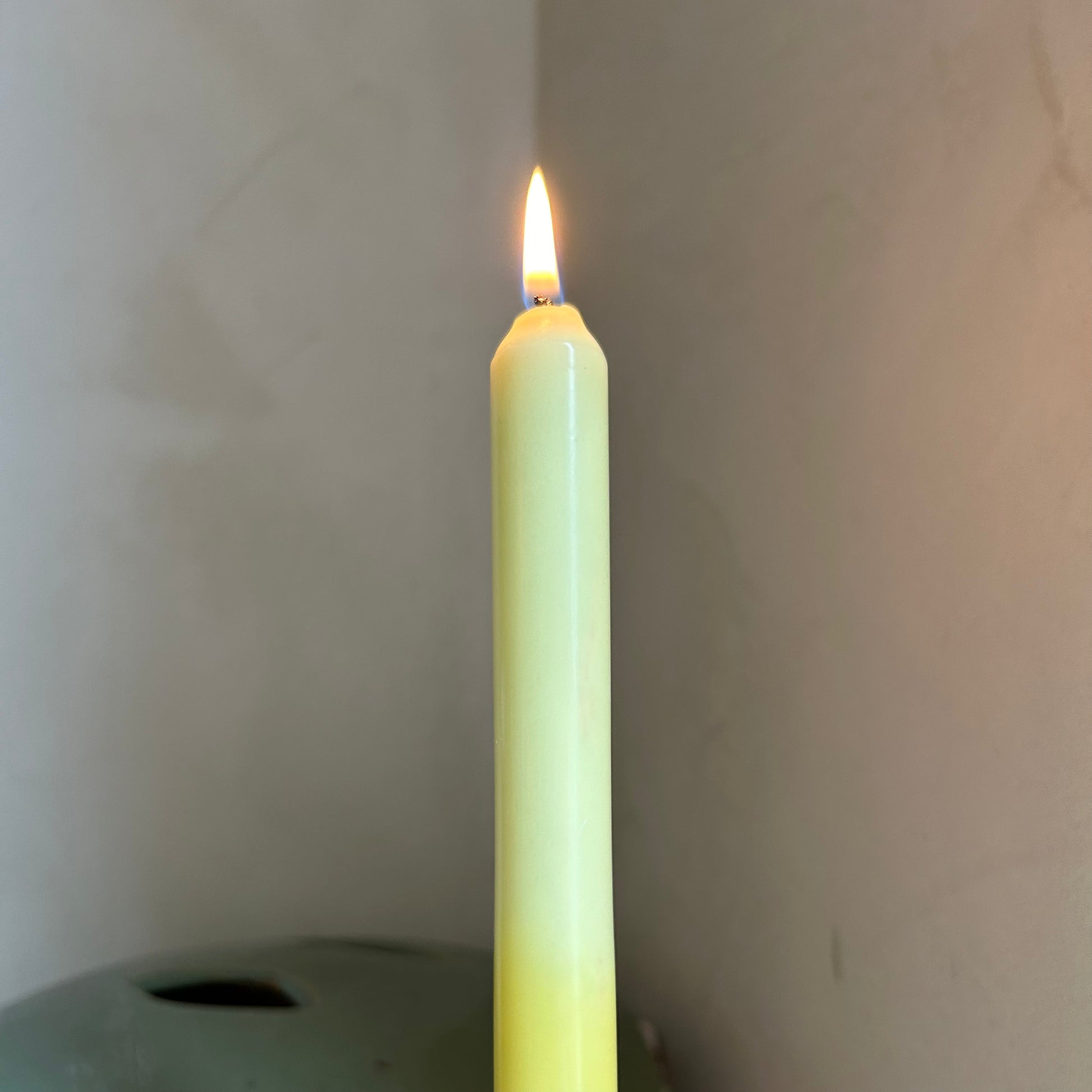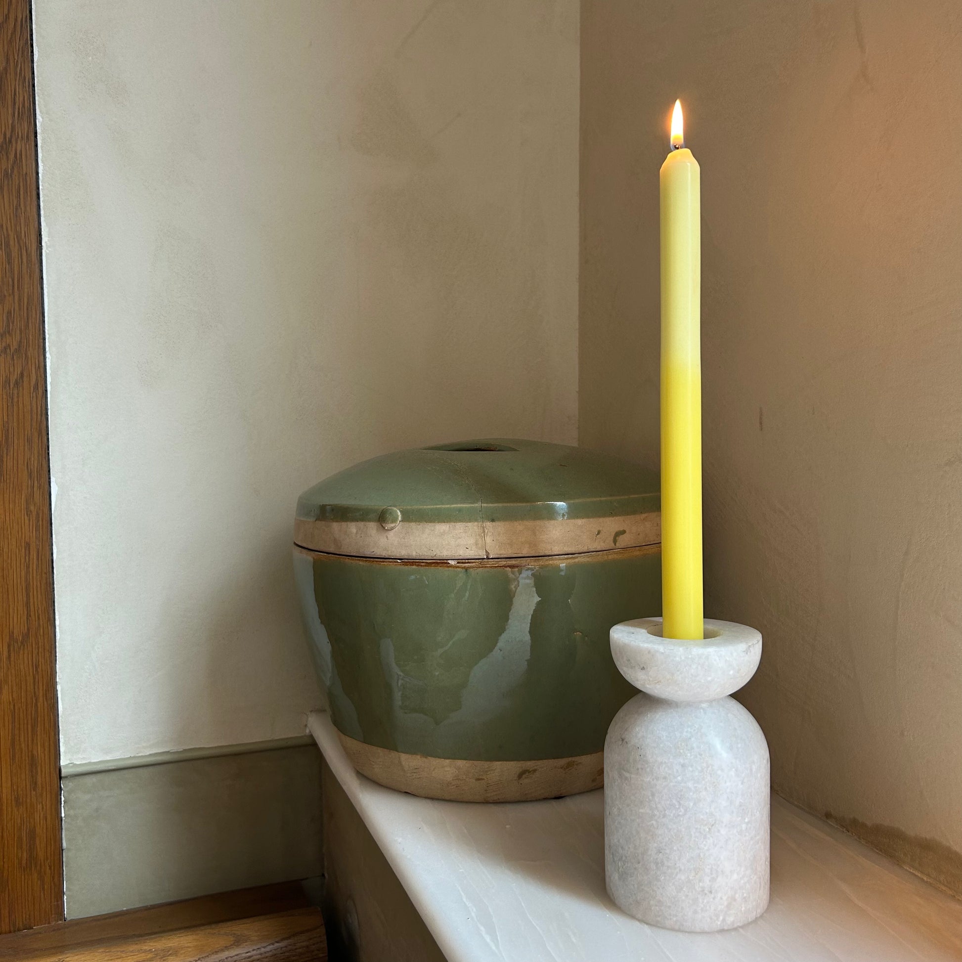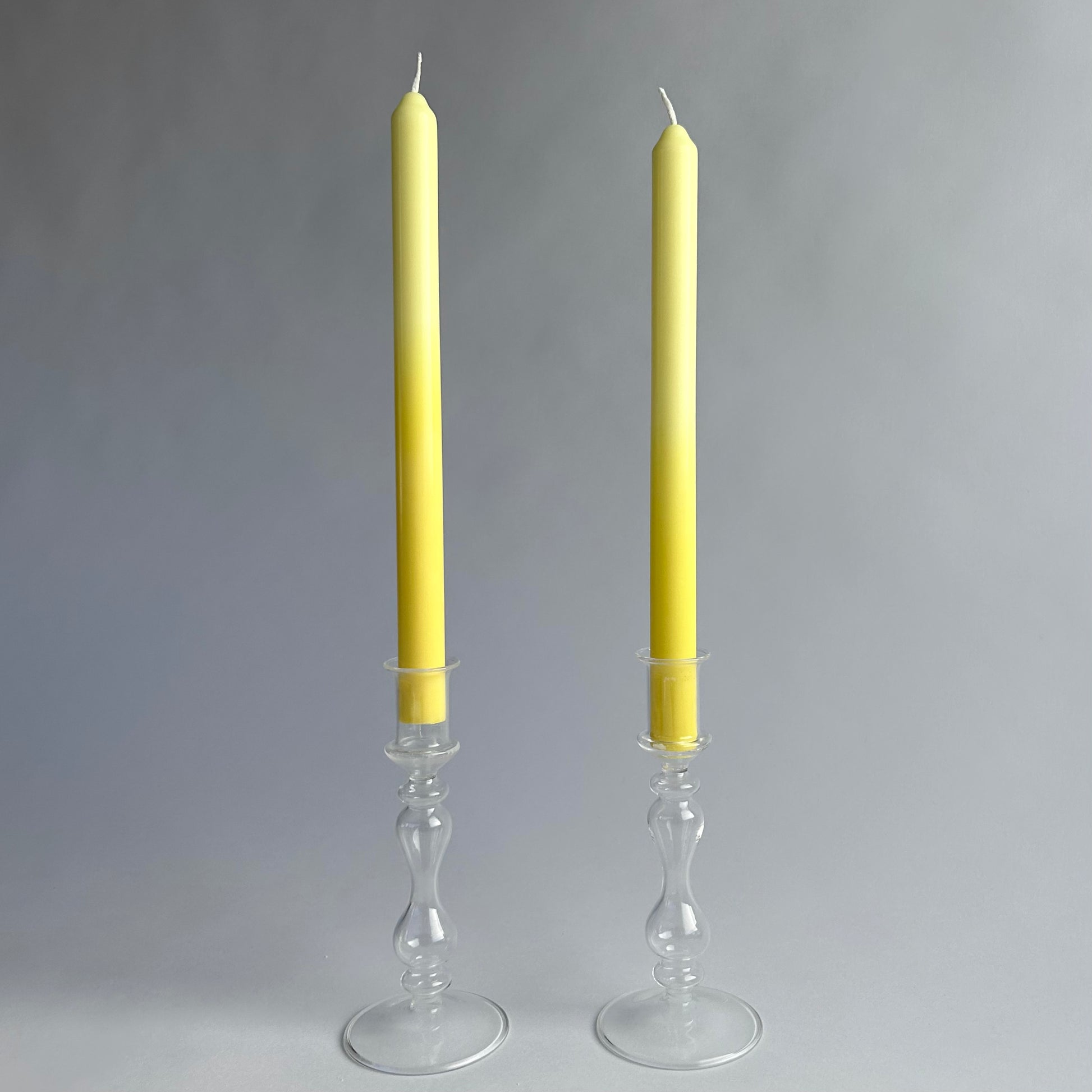 Pair of two natural wax dinner candles, hand-poured into a faded design of varying buttercup yellow tones.